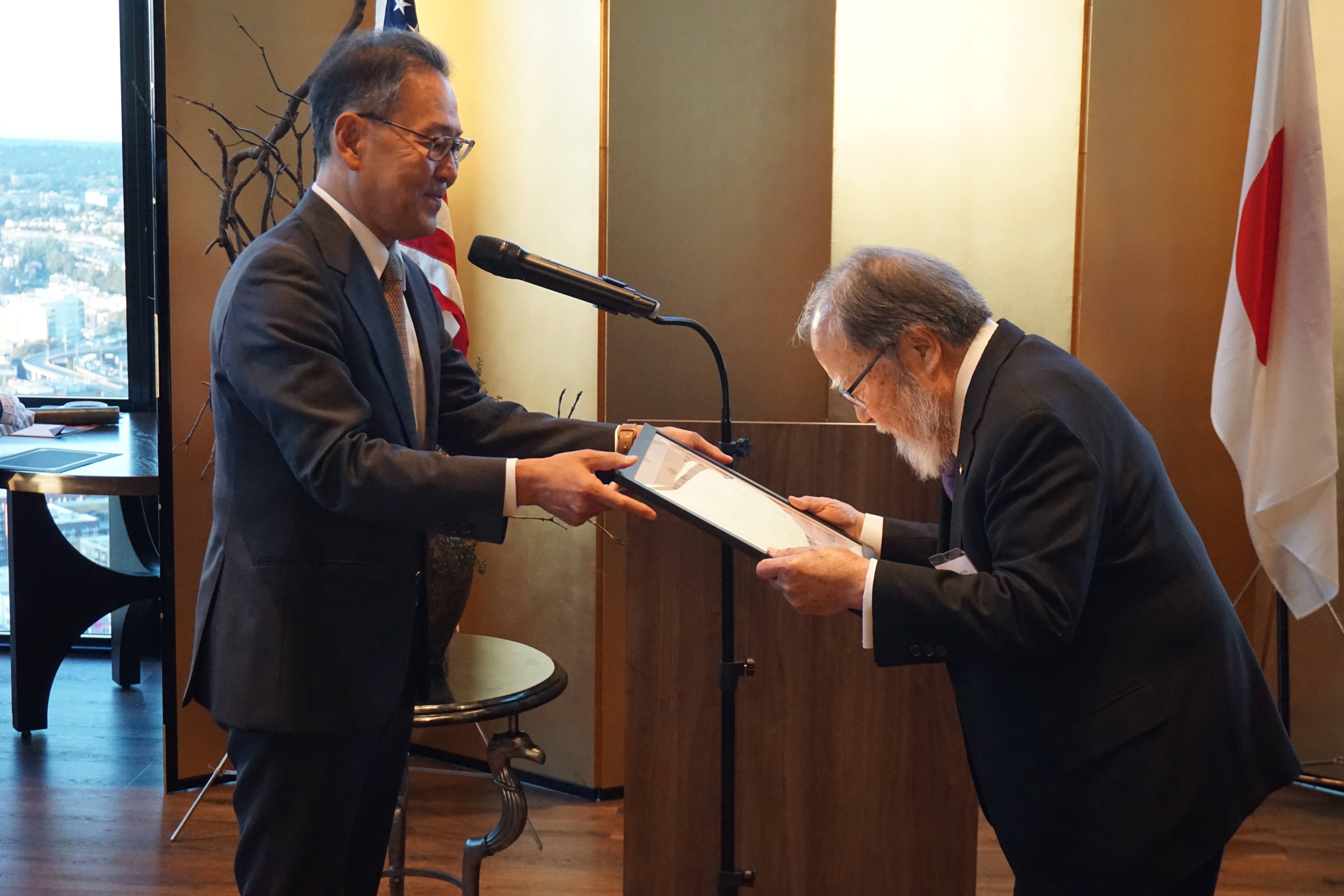 Consul General of Japan in Seattle IYORI Makoto expressed his appreciation for Dr. Sumida’s many years of continued contributions and formally conferred the Commendation. Dr. Sumida reflected on his career teaching American Studies courses at universities in the United States and Japan, and his efforts to promote understanding of Japanese culture and Japanese Americans in the United States. He thanked his family and colleagues for their support and expressed gratitude for the honor of receiving the Foreign Minister’s Commendation.