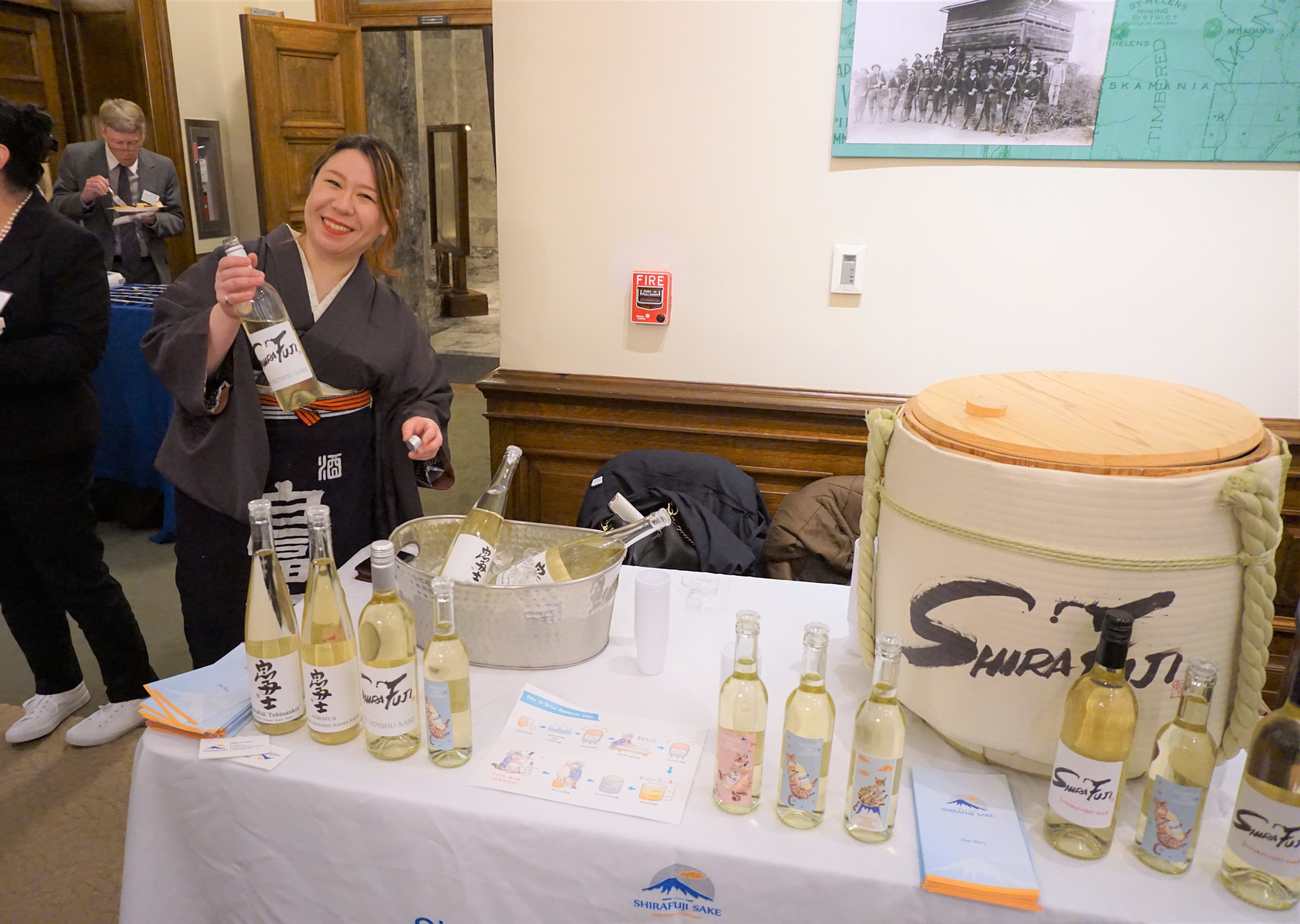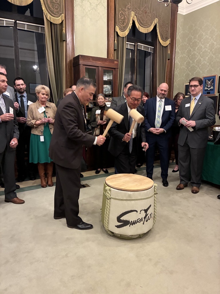 セミナー終了後には、州務長官室にてレセプションが開催されました。伊従総領事とホブズ州務長官が「鏡開き」を行った後、ホブズ長官による乾杯の挨拶で、日本とワシントン州の協力関係の更なる繁栄が祈念されました。