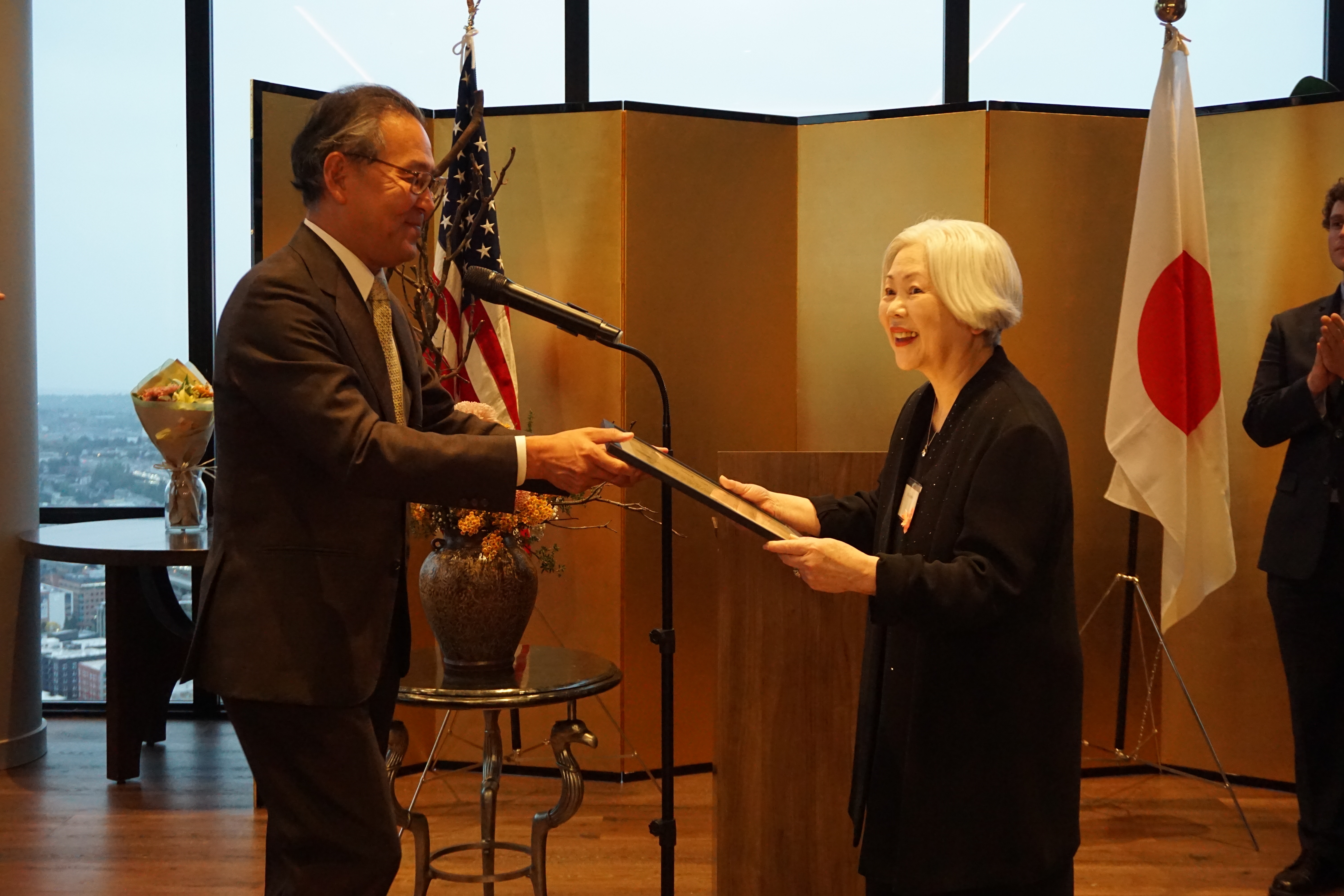 式典では、伊従総領事から曾我部氏の長年の功績をたたえる祝辞が述べられ、賞状及び副賞が授与されました。その後、曾我部氏から、初めて作品が売れた日から今日に至るまでの切り絵作家としての活動や、パイク・プレイス・マーケットに飾られた日系人の歴史を現したパネルを含むこれまで手がけた作品についての言及とともに、関係者への感謝と、外務大臣表彰の栄誉への謝意が表されました。